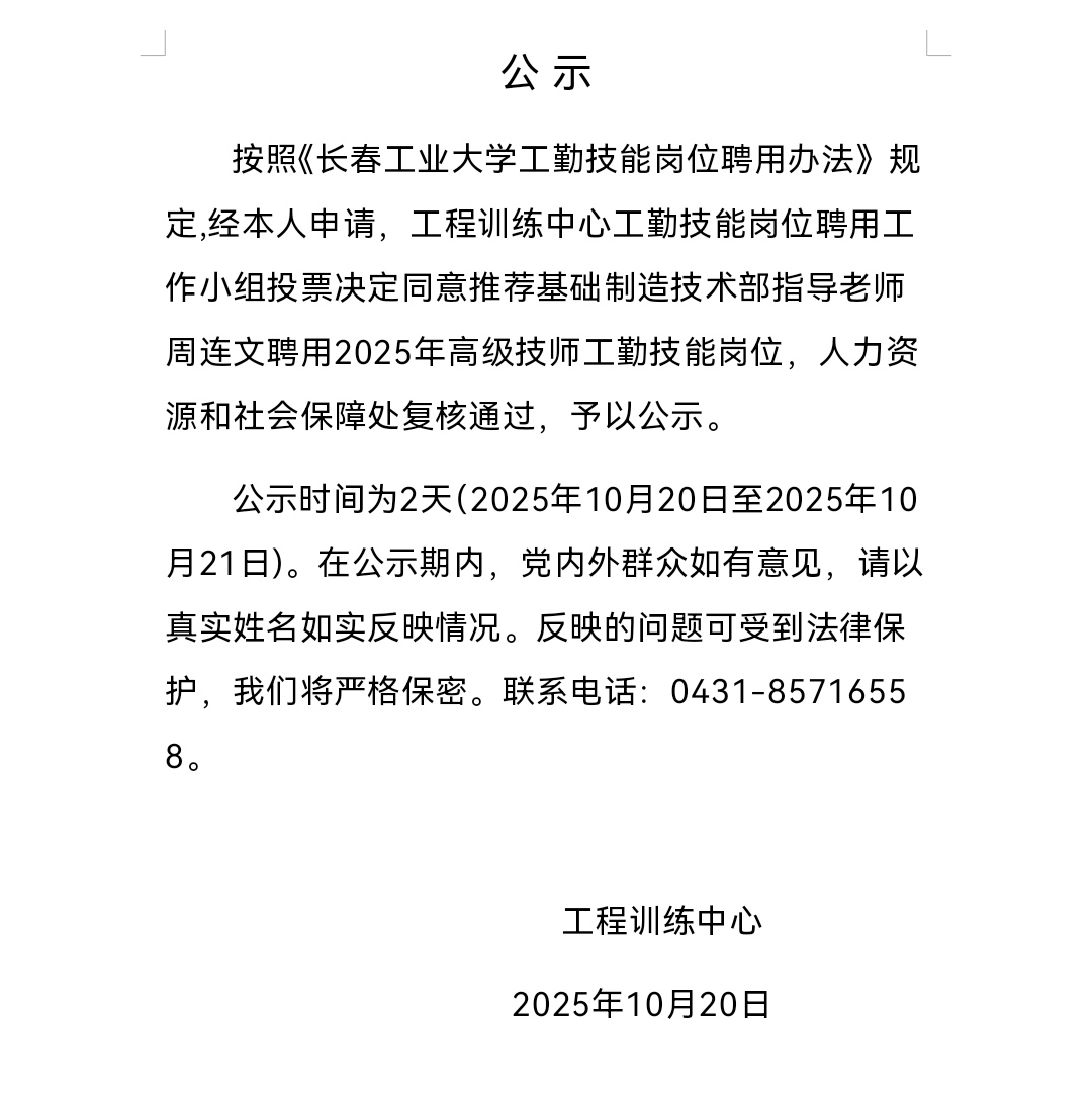 周连文老师工勤技能岗位公示